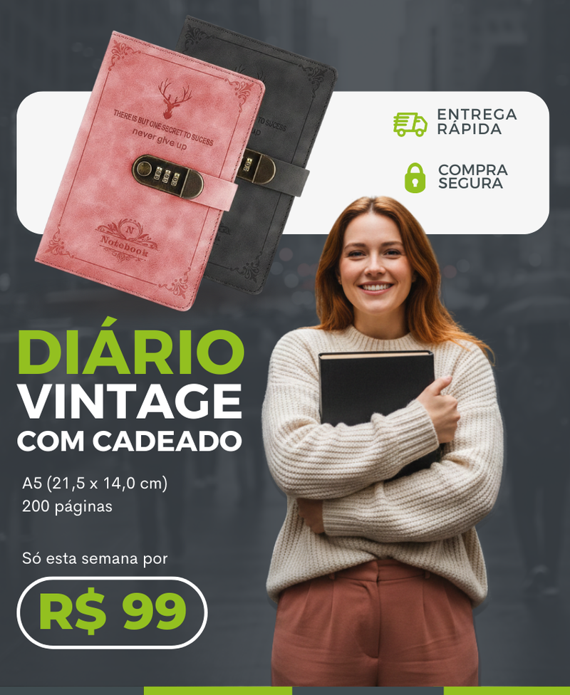 Diário Vintage Chumbo 200 pags com Fechadura e Senha - A5 (21,5 x 14,5 cm)